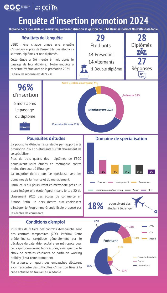 Chaque année, l’EGC Business School Nouvelle-Calédonie réalise une enquête d’insertion afin de mesurer la situation professionnelle et académique de ses étudiants six mois après l’obtention de leur diplôme de Responsable en marketing, commercialisation et gestion.