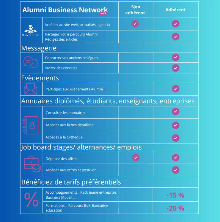 - Êtes informé via des actualités, Newsletter, Portraits, des articles : Welcome to the jungle - Êtes visible grâce à un portrait parcours Alumni - Êtes contributeur en devenant mentor ou coach, animateur des conférences, formateur ... - Êtes invité à nos évènements exclusifs |